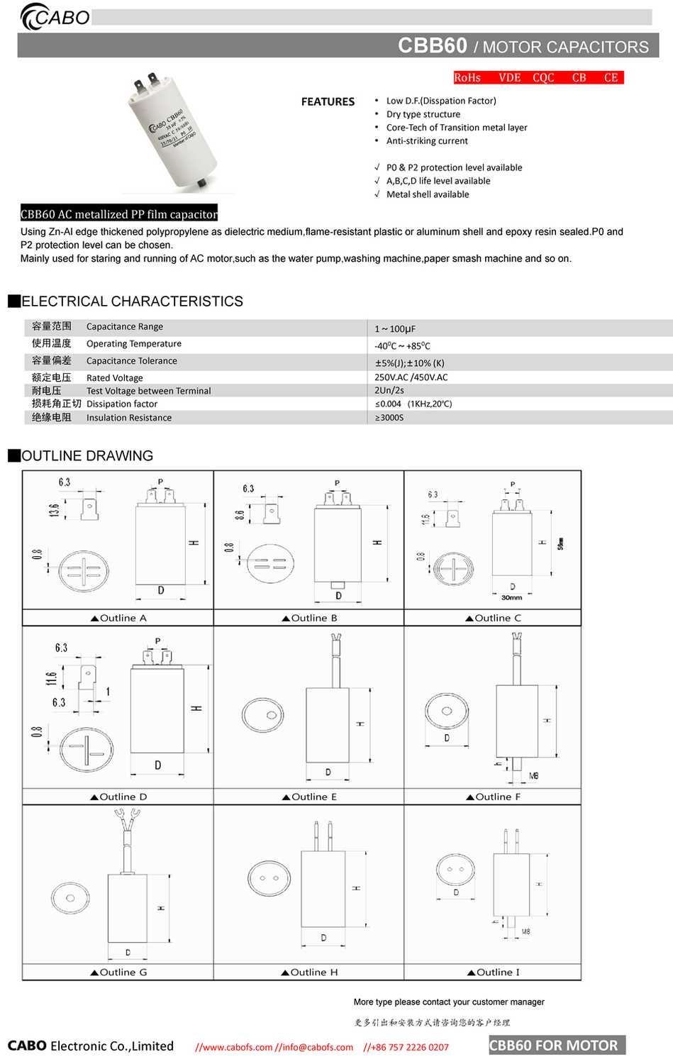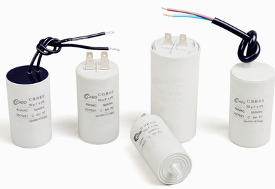 AC Motor capacitorsMotor capacitors AC induction motors, also known as asynchronous motors, use a rotating magnetic field to produce torque. Three-phase motors are widely used because they are reliable and economical. The rotating magnetic field is easily achieved in three-phase asynchronous motors because the phase angle offset between the individual phases is 120 degrees. However, single-phase AC motors require external circuitry which creates the phase angle offset in order to produce a rotating magnetic field. This circuitry can be realized using advanced power electronics, or more simply using a motor capacitor. AC single-phase induction motorsSingle-coil AC induction motorsAC induction motors usually use two or more coils to generate a rotating magnetic field, which produces torque on the rotor. When a single coil is used, it will generate a pulsating magnetic field, which is enough to sustain rotation, but not sufficient to start the motor from a standstill. Motors with a single coil have to be started by using an external force, and can rotate in either direction. The direction of the rotation depends on the external force. If the motor was started in a clockwise direction, it will continue to rotate and build up speed in the clockwise direction, until it reaches a maximum speed which is defined by the power source frequency. Similarly, it will continue rotating counter-clockwise if the initial rotation was counter-clockwise. These motors are not practical due to their inability to reliably start rotation on their own. Start capacitor AC induction motorsOne way to improve on the single coil design is by using an auxiliary coil in series with a motor starting capacitor. The auxiliary coil, also called starting coil, is used to create an initial rotating magnetic field. In order to create a rotating magnetic field, the current flowing through the main winding must be out of phase in respect to the current flowing through the auxiliary winding. The role of the starting capacitor is to lag the current in the auxiliary winding, bringing these two currents out of phase. When the rotor reaches sufficient speed, the auxiliary coil is disconnected from the circuit by means of a centrifugal switch, and the motor remains powered by a single coil creating a pulsating magnetic field. In this sense, the auxiliary coil in this design can be regarded as a starting coil, since it is only used during motor startup. Start/run capacitor AC induction motorsAnother way to further improve on the single-coil single-phase induction motor design is to introduce an auxiliary coil, which remains powered not only during the motor startup phase, but also during normal operation. As opposed to an AC motor using only a motor start capacitor, which creates a pulsating magnetic field during normal operation, AC motors using a motor start capacitor and a motor run capacitor create a rotating magnetic field during normal operation. The function of the motor start capacitor remains the same as in the previous case – it gets disconnected from the circuit after the rotor reaches a predetermined speed by means of a centrifugal switch. After that point, the auxiliary winding remains powered through a motor run capacitor. The figure below describes this type of design. |